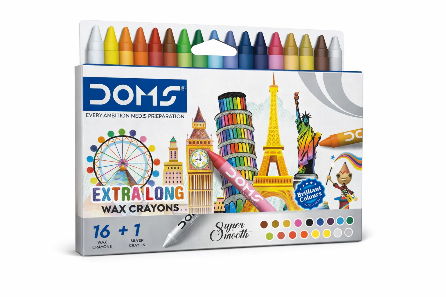 DOMS Extra Long Wax Crayons are high-quality, professional-grade coloring tools designed for young artists at school or home. This set features 16 vibrant, assorted shades plus 1 free silver crayon, providing a rich and broad palette to fuel creativity and imagination. Each 90 mm extra-long crayon is crafted for an easy and comfortable grip, making them perfect for developing fine motor skills in children. The super smooth and soft texture ensures effortless, even coverage and silky coloring on various paper surfaces without skipping or streaking. Safety is a top priority, as these crayons are non-toxic and completely safe for children aged 3 and above. These smudge-free and long-lasting crayons are an ideal, cost-effective choice for everything from daily school assignments to intricate home art projects.